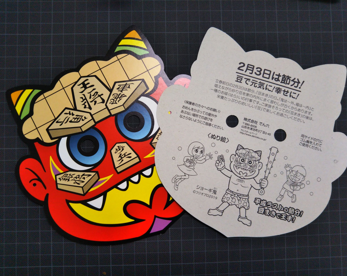 故 赤塚不二夫さんのフジオ・プロによる、でん六の、節分の鬼のお面シリーズ6種。 それに、その他のお面3種、合計9点セット。 でん六のほうは、今年も「でん六節分キャンペーン」でお馴染み "赤塚不二夫(フジオプロ)の鬼の面"が スーパー・コンビニに登場しています! 今年は、バタフライの波でデザインされた迫力のある眉毛、 市松模様のクールジャパンなほっぺ、逆三角形の体型と"赤塚不二夫(フジオプロ)の鬼の面" 40作目を迎えた今年は「ハチマキ鬼」です。 スーパー・コンビニで、でん六の節分企画商品を買うと、 もれなく「ハチマキ鬼」のお面がもらえます。 ミニサイズのお面が入った「でんちゃん福ます」も発売中。